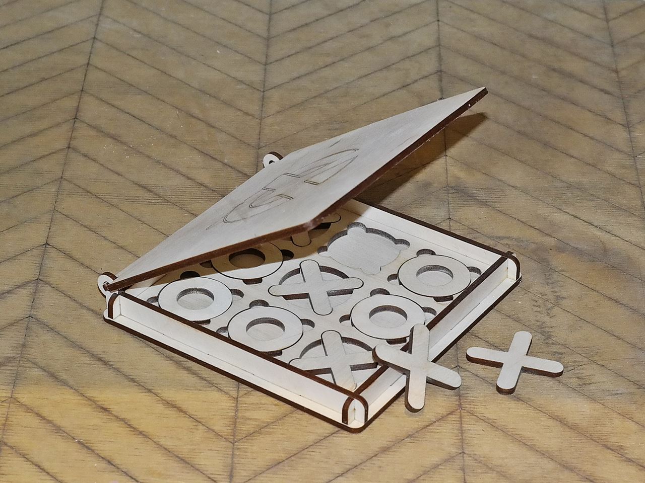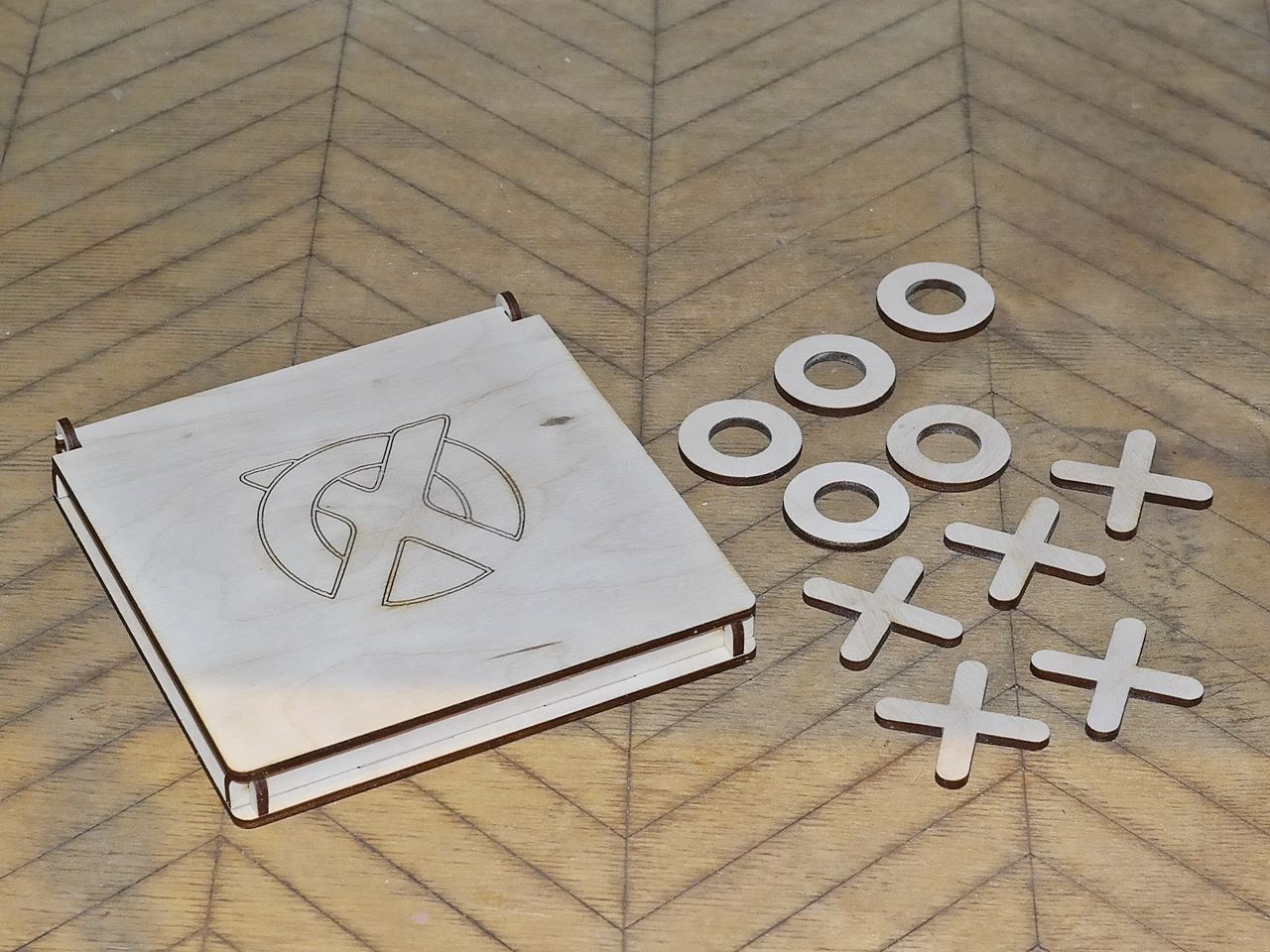 W skład produktu wchodzi grawerowane pudełko oraz 5 kółek i 5 krzyżyków.