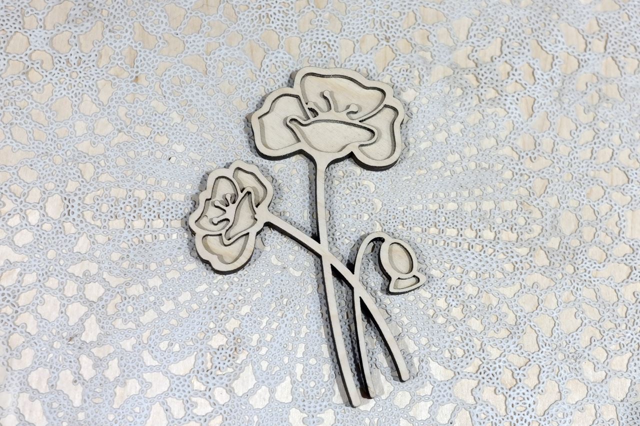 Kwiat wykonany został z dwóch warstw sklejki 3 mm ciętej laserowo.